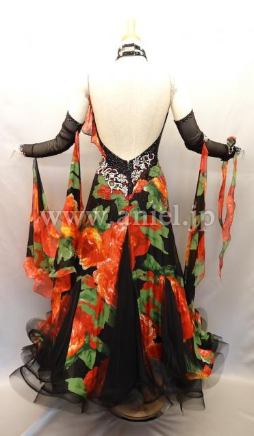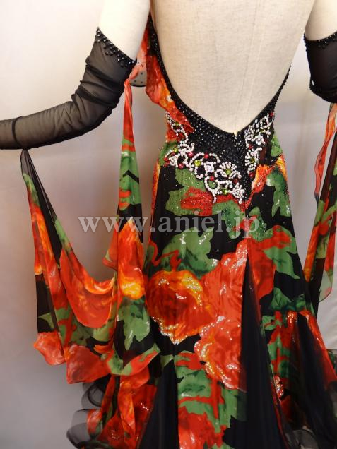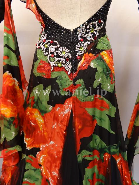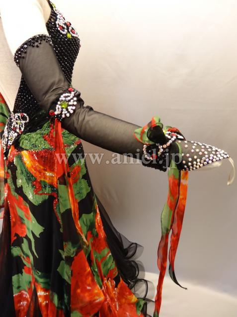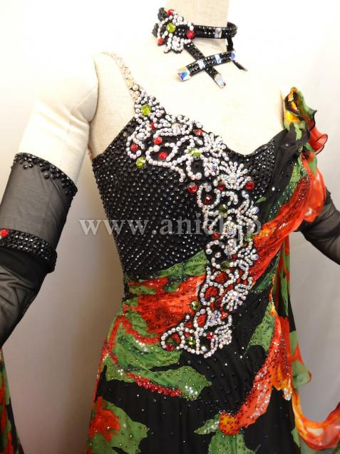 黒地に赤い花柄がとても目立ちます。ボディやアクセサリーにはストーンがびっしりと貼られとてもゴージャスで華やかです。