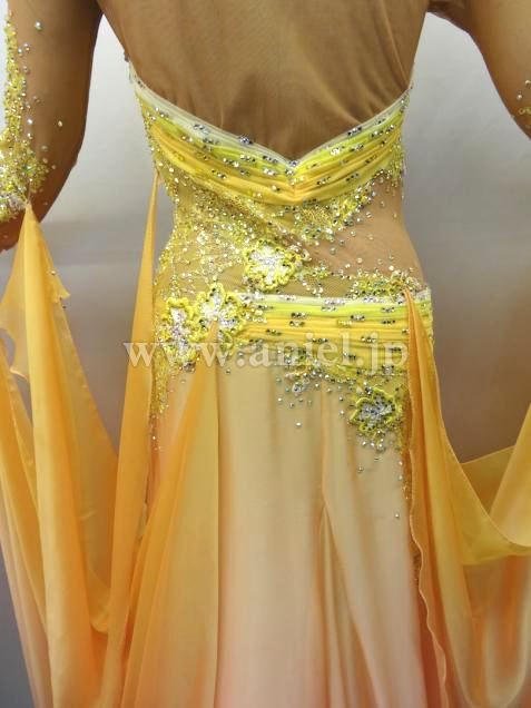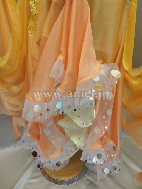 スカートとフロートには黄色から淡いオレンジへの美しいグラデーション生地が使われていて、裾にはスパンコールが散らされ踊るとキラキラと光ります。