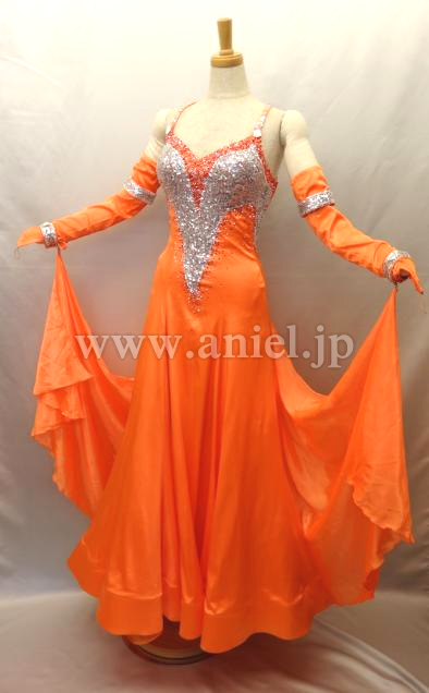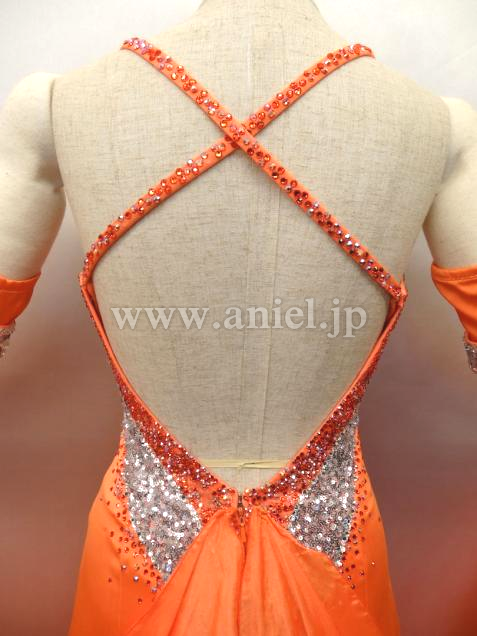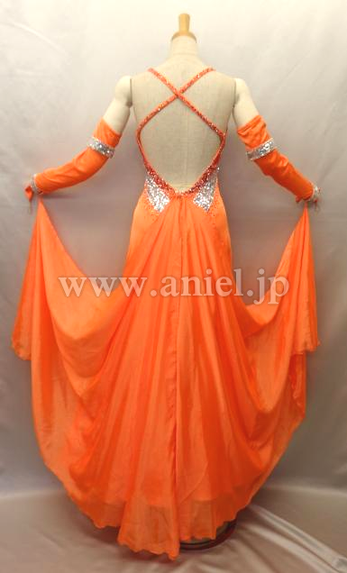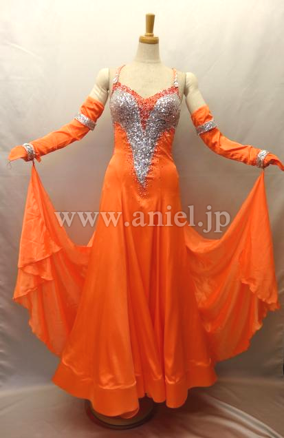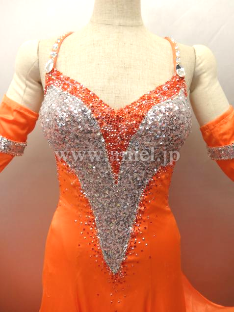 クリスアンの鮮やかなオレンジ色のドレスです。ボディのシルバーのスパンコール生地がよく輝いてフロアで目立ちます。