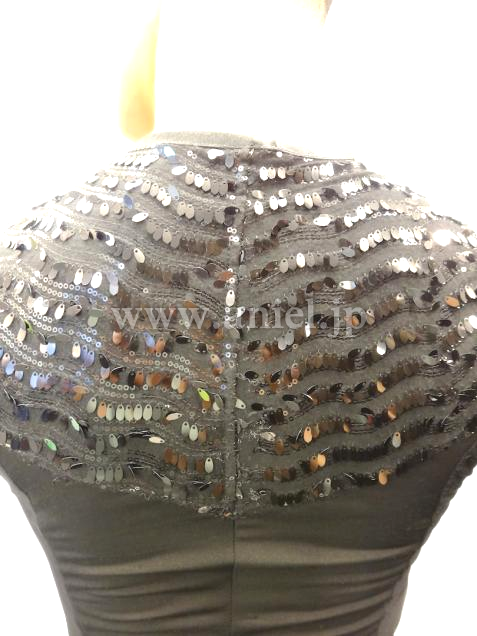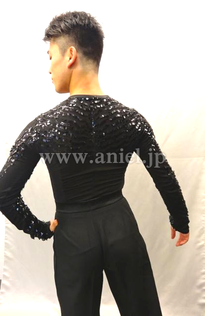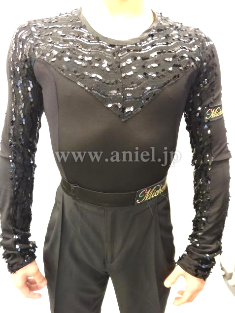 リカルド・コッキ、マウリッツィオ・ベスコボなど有名選手をスポンサーしているイタリアの老舗メーカーAltamoda Micheliniの既製品のラテンシャツです。黒のクレープ生地にアシンメトリーに流れの出るスパン生地が縫い付けられています。サイドはシースルーになっています。