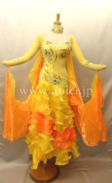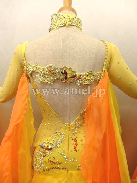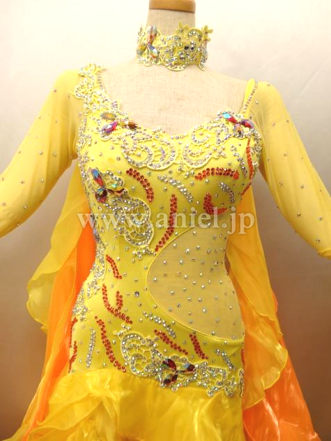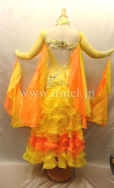 ウエストのネットの切り替えが変っています。フリルも一杯でとてもお洒落なドレスです。石はセレクト石等を使っております。スワロと比べると見劣りしますがこのままでもかなり輝きます。高級ドレスに近付けたい方はスワロなどのストーンを付けたして装飾しても良いかもしれません。