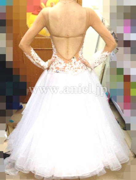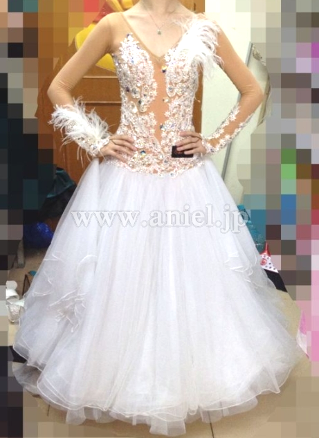 セクシーなベージュのボディに白のレース、スカートが美しく映えるドレスです。