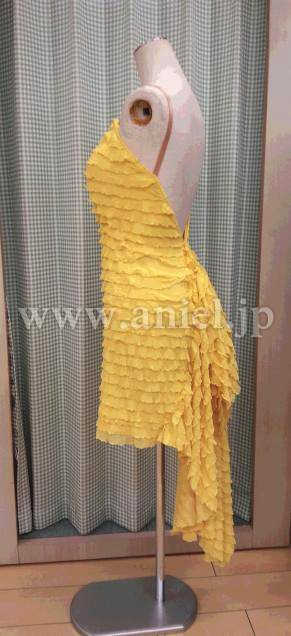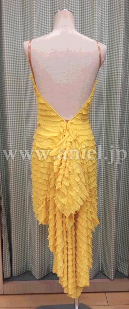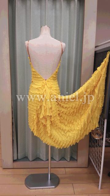 段々のフリルが、全面にあしらわれた生地で、フリフリと可愛い印象のドレスです。尾長鶏の尻尾のような後ろのドレープが、大きく動きとてもダナミックでもあります。
