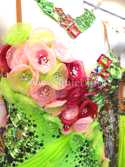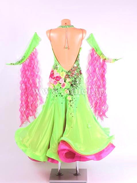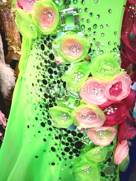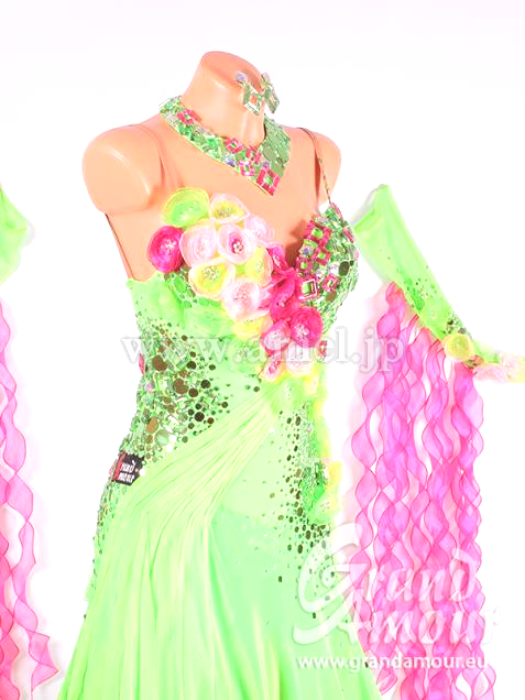 Grand Amourの新作ドレスです。発色のいいエレクトリックグリーンにピンク系のインパクトある装飾が付けられています。スワロなどの高級ストーンとは別に、新たな素材の使用を試みており、スクエア型の変わったストーンが縫い付けられています。素材はクリスタルではなくアクリルですが、非常に面白いアクセントになっており、ポップな印象を与え、デザイナーさんのセンスが光る一点となっています。胴回りが多少ゆとりある作りになっているため、サイズを気にされているお客様でもご使用になれます。背中は開いていますが、露出を気にされない方であれば、問題なく着て頂けると思います。
