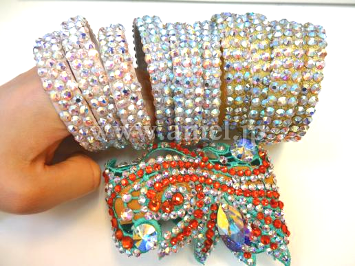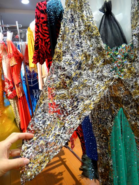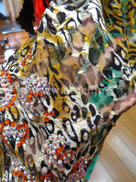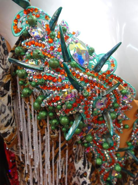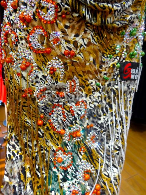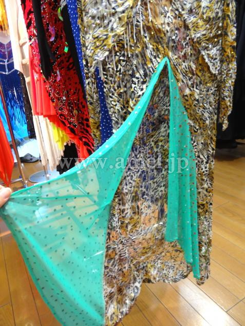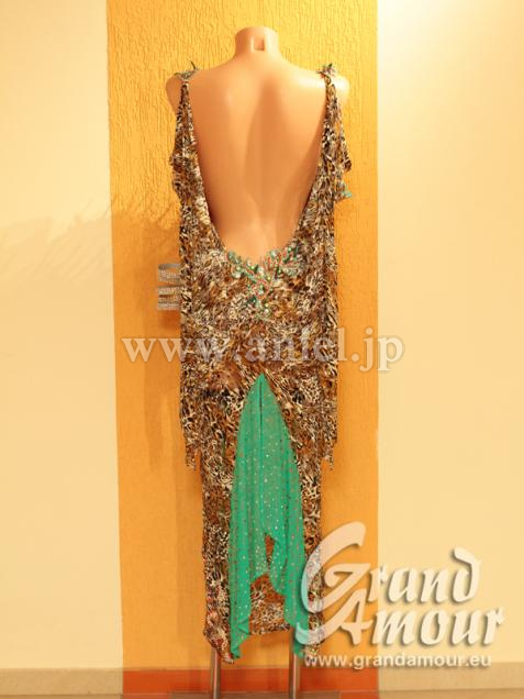 Grand Amourの新作ラテンドレスです。珍しいジャガー柄のストレッチネットにグリーンの装飾が施されています。グリーンの光沢の無い面白い石がついており、ワイルドさを強調しています。バランスよく縫い付けられたビーズフリンジがマーメイドのようなラインを演出しています。背中のスィングのひれがマントのように見えます。バックラインにも動きが出るように設計されています。後ろのグリーンの布はストレッチネットなので適度に足が透けセクシーなラインが見えます。腕輪が白・シルバー・ゴールドの計10本と二の腕のバングルが付いています。ワイルドながらセクシーで女性らしいドレスです。