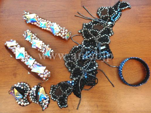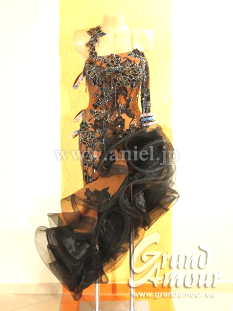 Grand AmourでスポンサーしているウクライナのプロフェッショナルダンサーTanya Borovykのスポンサードレスです。セクシーなタンカラーに黒のレースで装飾が施されたとても美しいドレスです。コンペで1度使用しましたが、状態は未使用に近いくらい、他のスポンサードレスよりもかなり美品で使用感がありません。装飾一つ一つが繊細で細かく、スポンサーへの意気込みが感じられるゴージャスなドレスです。付属品は腕輪・ヘアオーナメント・ピアスです。