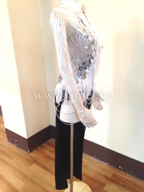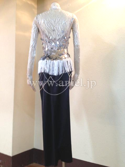 黒のロングスカートに白のネットで上半身を覆った露出の少ないドレスです。