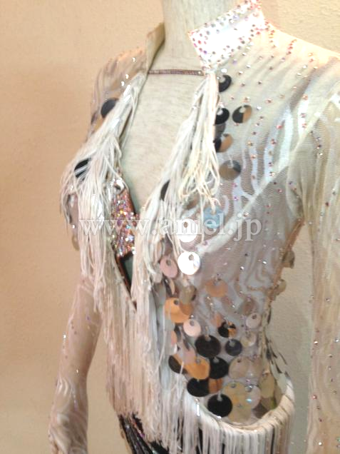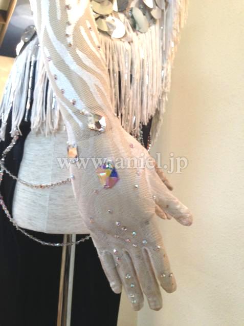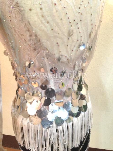 ネットの帽子も付いていて、胸元にはスワロフスキー・竹ビーズ・フリンジを用いている個性的なドレスです。