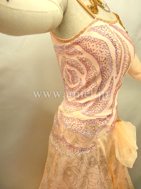 美しいシャンパンピンクのボディのサイドに大輪の薔薇がストーンで描かれています。