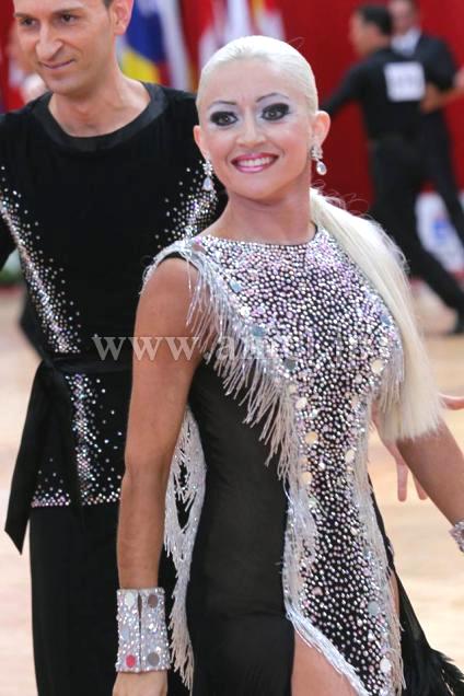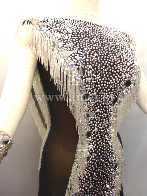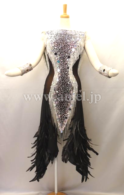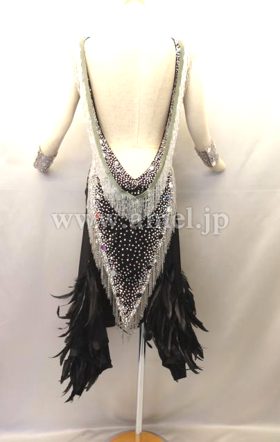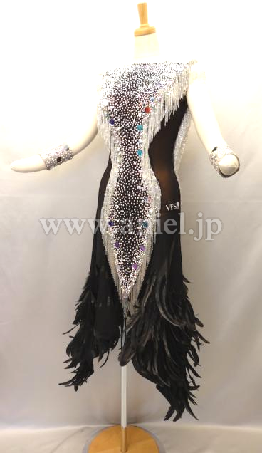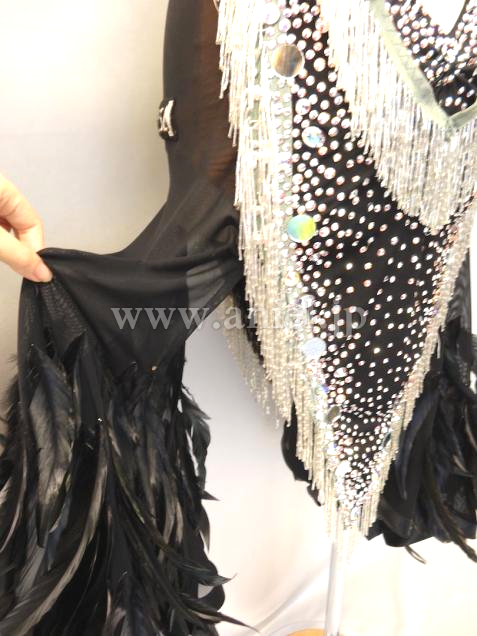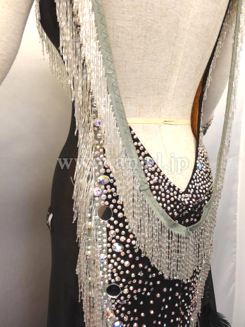 黒のボディにオーロラのスワロフスキーストーンとビーズフリンジがびっしりと付けられ非常に豪華です。