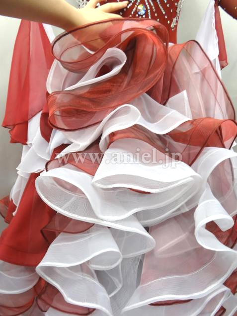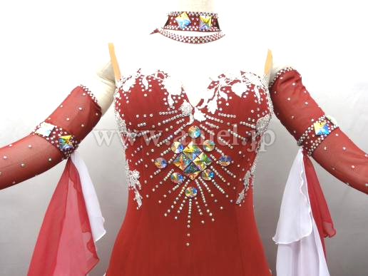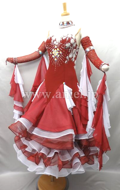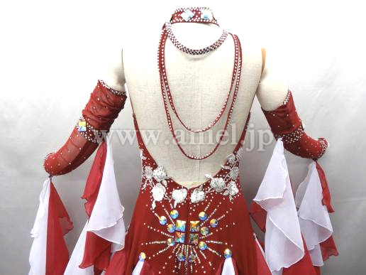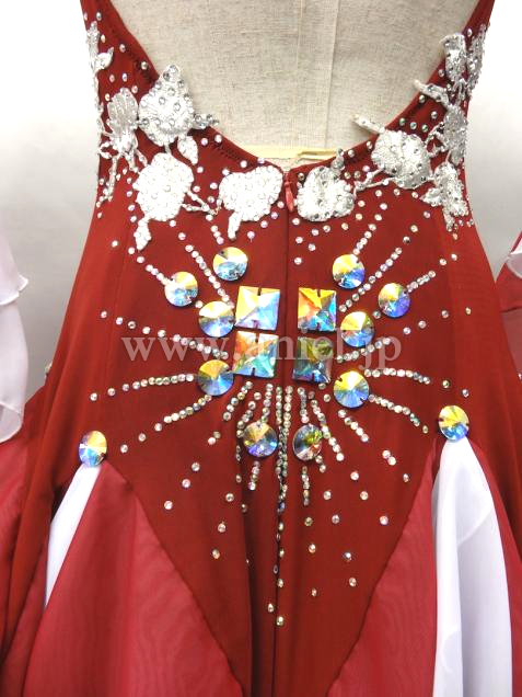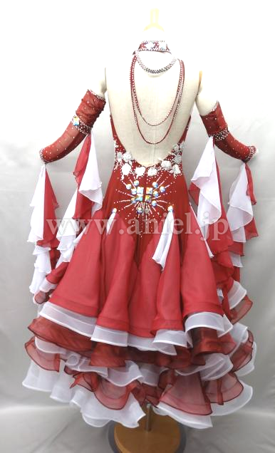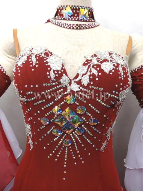 大人っぽいワインレッドカラーに美しい白のコントラストが映えるドレスです。