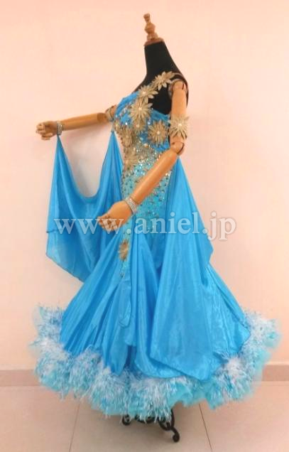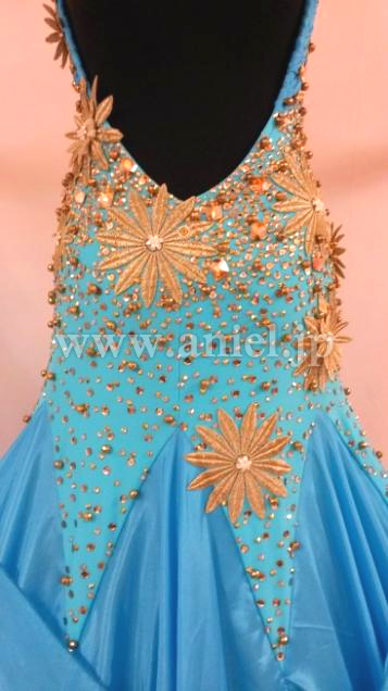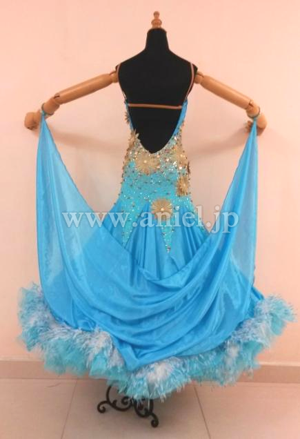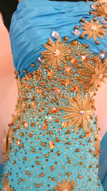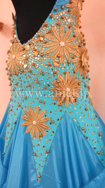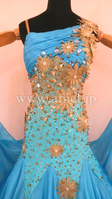 ターコイズブルーにイギリス製ゴールドのモチーフがあしらわれたドレスです。