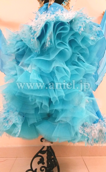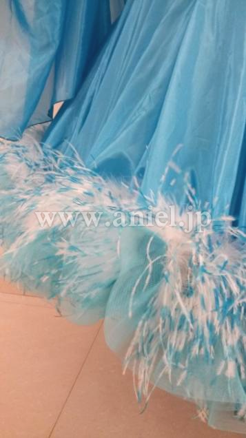 スカートのホースヘアーには白と青の羽根が付けられ可愛らしくドレスを彩っています。