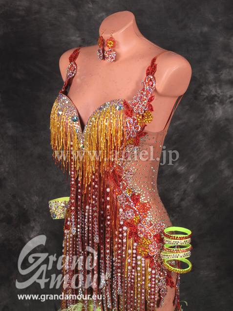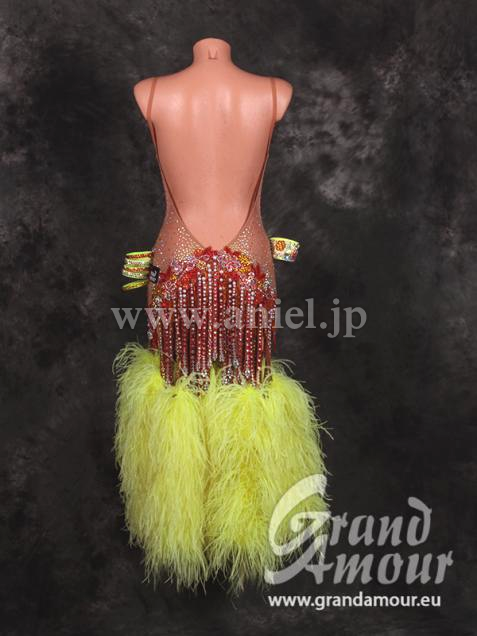 Grand Amourの新作ドレスです。ヌードカラーのボディにハンドメイドの短冊フリンジがびっしりと付けられて非常に豪華です。スカートはライムイエローのボアが付けられており、非常にボリュームが出ます。かなり攻めたデザインなので、強く見せたい方にお勧めなデザインです。