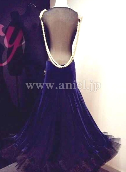 スカートにはホースヘアーがつけられ踊るとよく広がります。胸元から背中にかけてパールのチェーンが装飾されています。