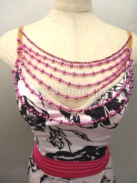 胸元にはパールとストーンのチェーンがあしらわれています。スカートは裾にホースヘアーが足されAラインになっています。