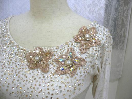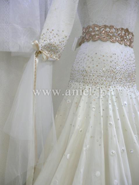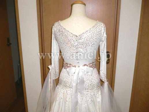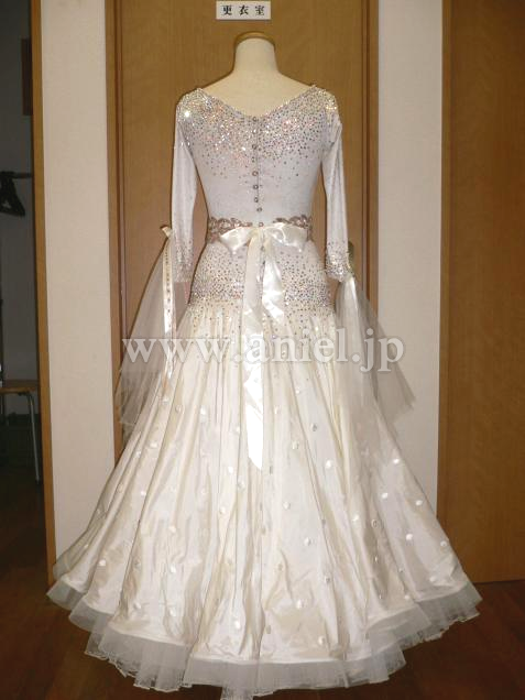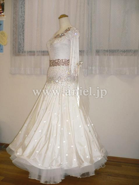 ボディはアイボリーに控えめにゴールドの柄が入ったストレッチライクラ素材で、デコルテ、肩、背中、腰、にはゴールド、クリスタルのスワロフスキがビッシリと貼られています。ゴールドの花のモチーフがアクセントになって、スカートは水玉の刺繍が美しいシルクのオーバースカートになっていてボリュームたっぷりです。ゴールドの花のオーナメントのベルトは後ろでサテンリボンを結ぶデザインです。袖は七分袖で、チュールとリボンが垂れ下がり全体的にシックでセンスあふれるドレスです。