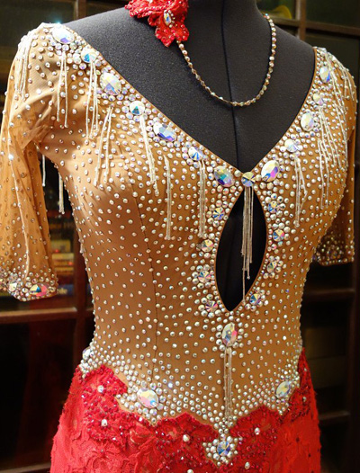上半身はスワロフスキーの石がびっしりと貼られていて、竹ビーズフリンジが動きを表現してくれます。