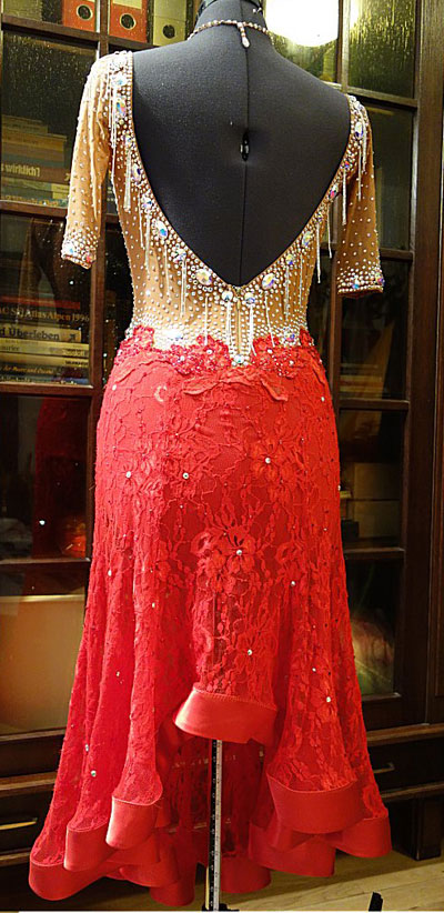 スカートは赤のストレッチレース素材で、裾には幅広のサテンテープの縁取りがあります。