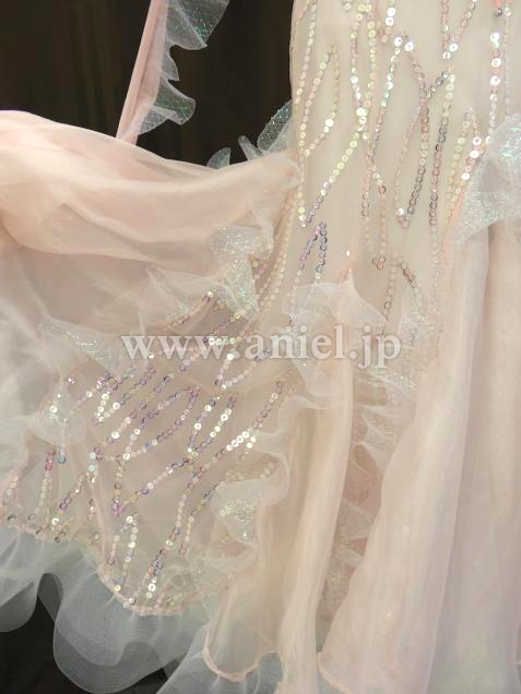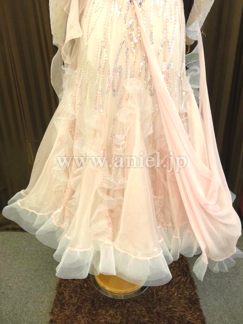 イタリア・サピエル社製ドレス、優しい色合いと個性的なデザインが面白いドレス。ハンドペインティングされた柄。スカートはスパンコールが使われており、キラキラとキレイなドレスです。