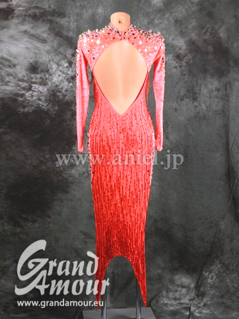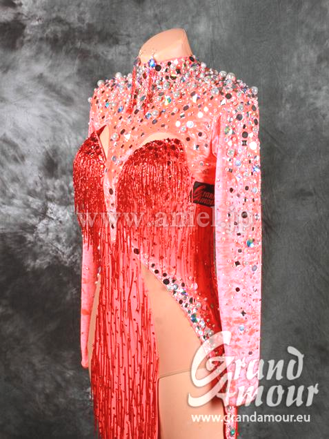 Grand Amourドレスの新作ドレスです。上半身はクラッシュベルベットにストーンやミラー、パールなどで装飾されています。長袖にタートルですが、股脇がシースルーになっていてハイレッグに見えるデザインです。デコルテとブラパッドの間にも隙間があり、露出する部分と覆われている部分のコントラストが官能的です。胸からスカートにかけてビーズフリンジがびっしりと付いています。