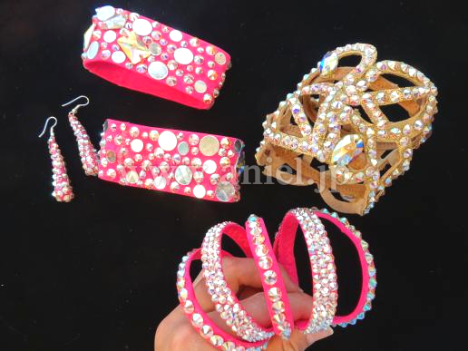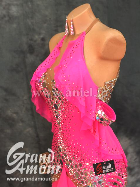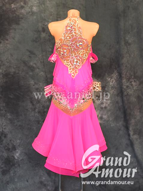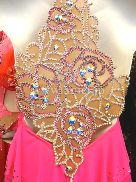 Grand Amourの新作ドレスです。ホルターネックのサイドからフリルのように布が付けられたエレガントなデザインです。適度な露出を演出するため、ベージュのネットが効果的に使われています。石は全てスワロフスキーを使用しております。背中のバラのハンドメイドレースが非常に芸術的で美しいです。発色のいいピンクフィズの布を使用しており、どんな会場でも明るく目立ちます。アクセサリー:モチーフの付いたもの1つ、ゴムの腕輪2本、輪っか5本、ピアスです。 ※アクセサリーは現状を優先します。