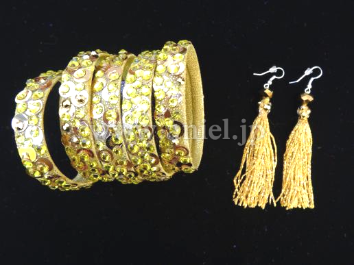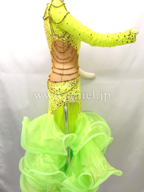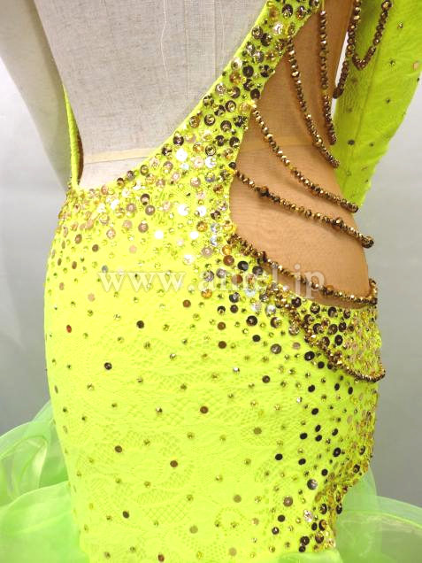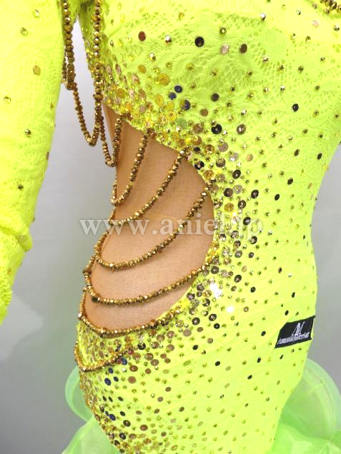ボディはゴールドのスパンコールやストーンが散りばめられキラキラと輝きます。サイドと胸元にはゴールドビーズでチェーンがあしらわれています。ボディにはレース生地が使用されています。