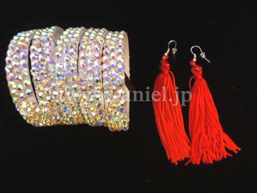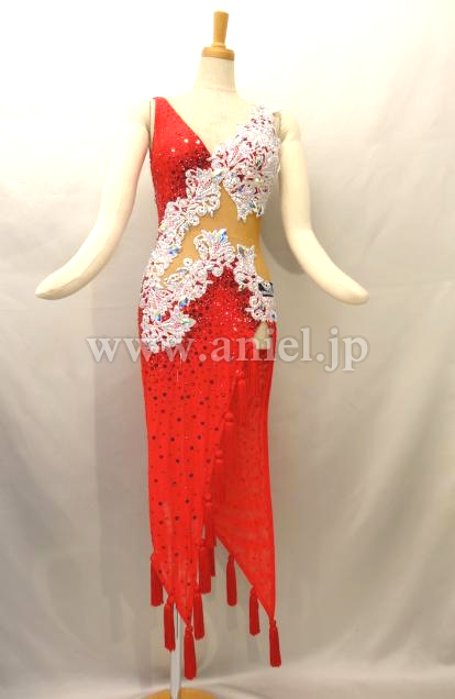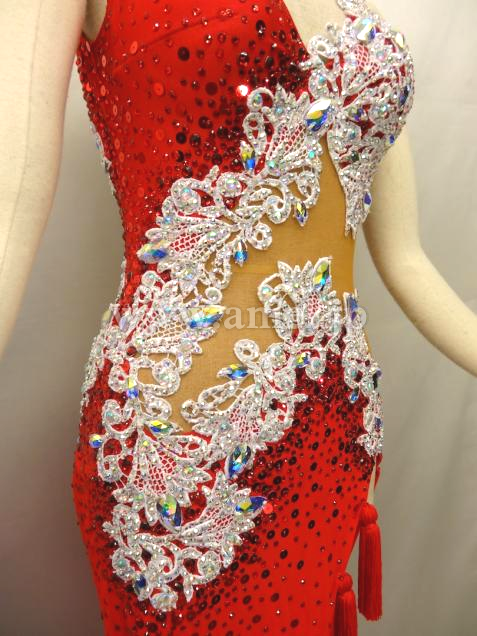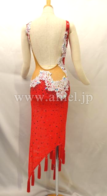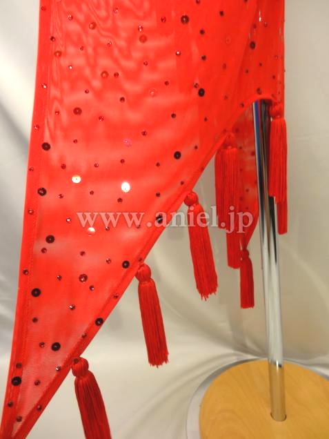透け感のある赤の生地が非常にセクシーで、裾に付けられたタッセル型フリンジがよく踊ります。