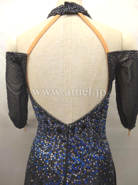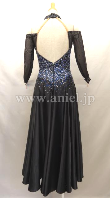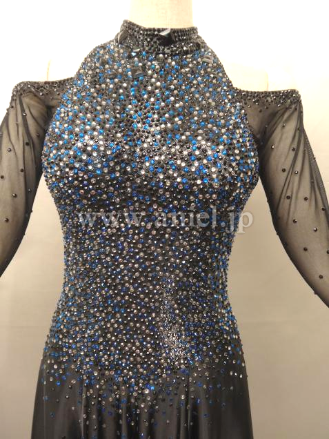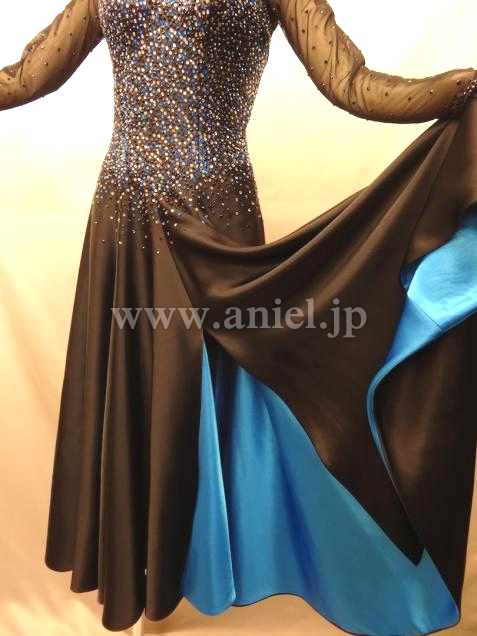 露出が少なく 上半身には石が全面に貼られ 石落ちもなく綺麗です。スカートは正面にスリットが入ってるので 振ると裏地のブルーが見えて素敵です。