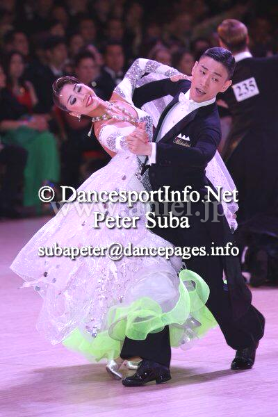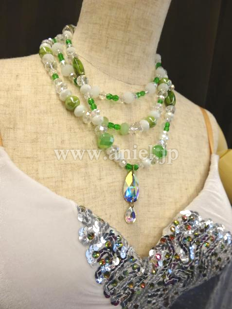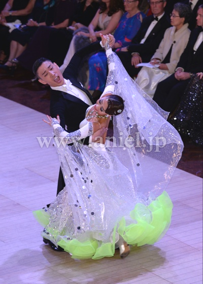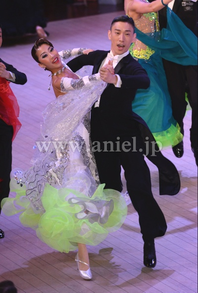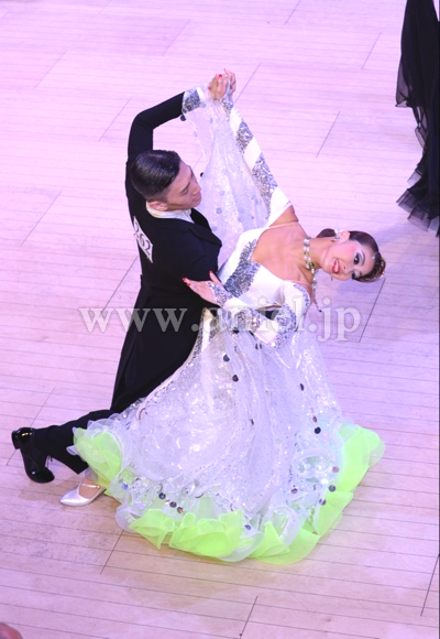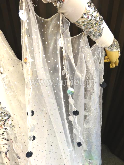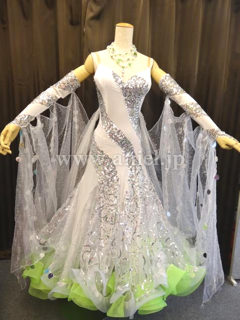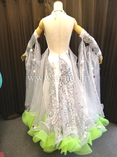 Altamoda Michelini制作。JBDFのA級本多龍士先生のパートナー戎野紗与先生のスポンサードレスです。白いスムースベルベットを主体にスパンコールのラインが幾何学模様を描いて縫い付けられています。トルソーが着ている写真は色が少し黄ばんで見えますが、実際はとても奇麗なホワイトカラーです。さりげない黄緑のさし色もインパクトがあります。フロートは大きく、スパンコールが付いたイタリア製の高級オーガンジーです。丁寧に付けられたスパンコールが上品な輝きを放つので、フロアで確実に目立つでしょう。