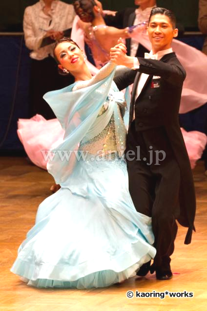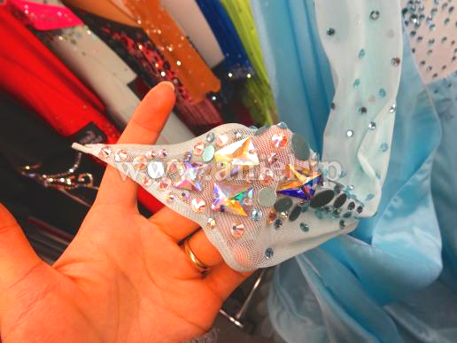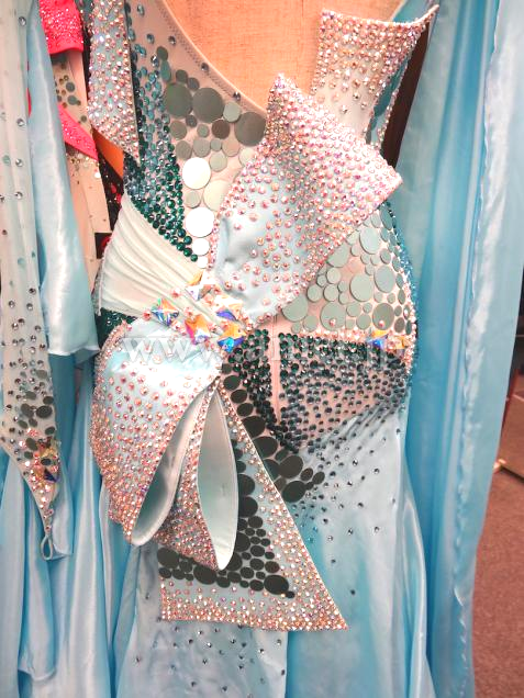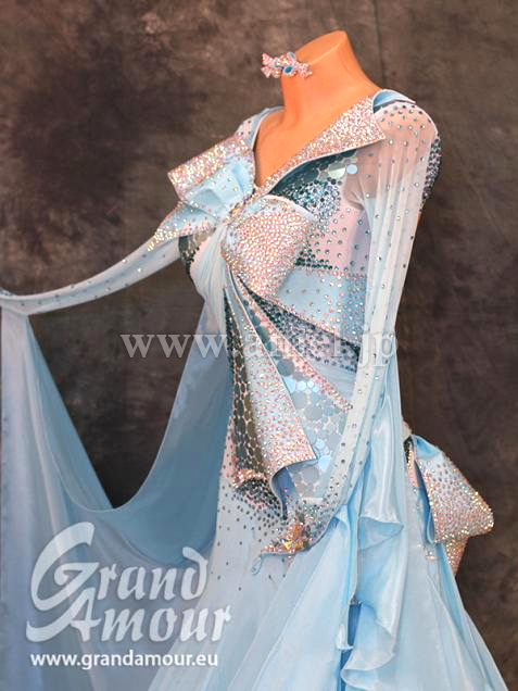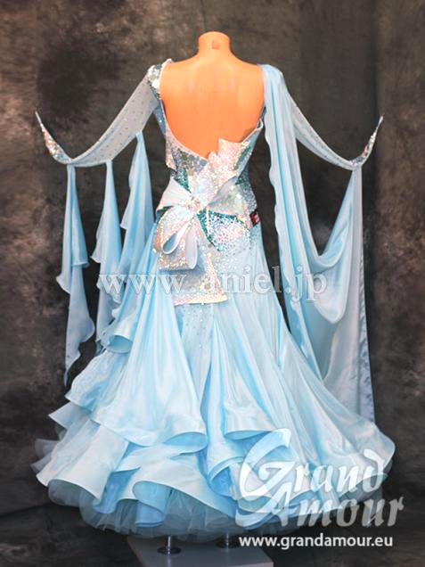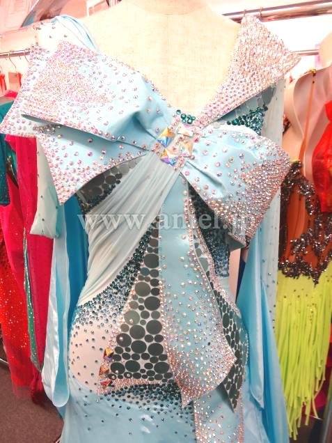 Grand AmourでスポンサーしているJBDFの金野哲也先生のパートナー井之口香織先生のスポンサードレスです。ペールターコイズのボリュームある豪華なドレスです。可愛らしいデザインですが、子供っぽくなく、身体も大きく見えるようなデザインとなっています。胸元にボリュームがあるため、デコルテの露出を気にされる方にもぴったりです。流行のリボンですが、Grand Amourらしい素敵なアレンジになっていて個性的です。