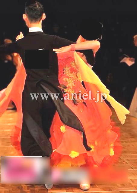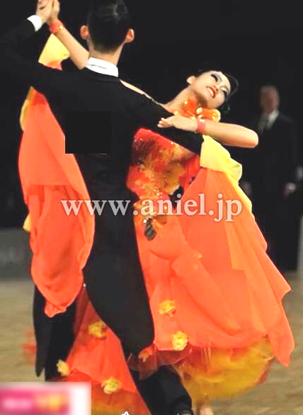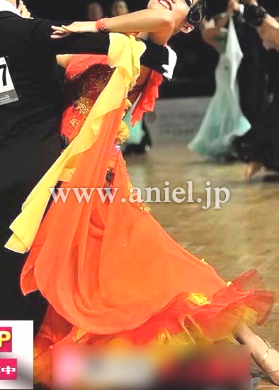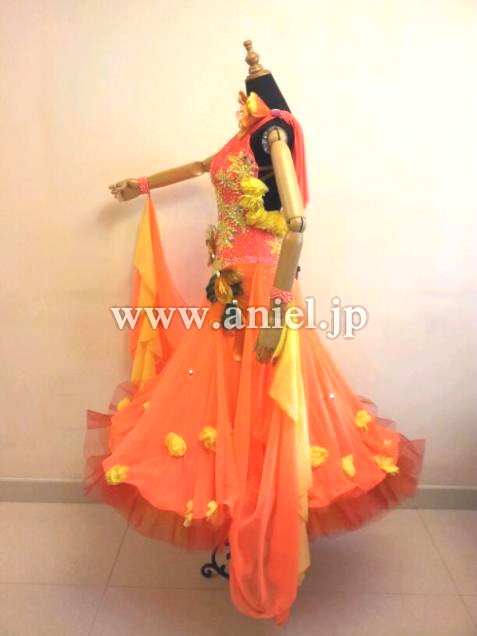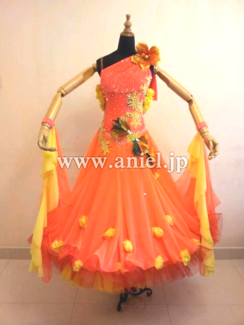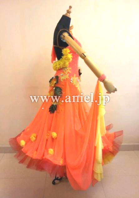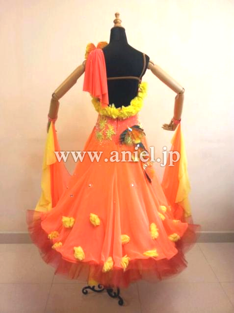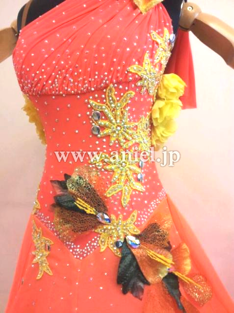とても目立つ明るいカラーのドレスです。立体の花モチーフやスカートや背中に飾られています。大きなフロートとボリュームたっぷりのドレスがよく舞います。たくさんのスワロフスキーで装飾されています。