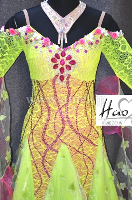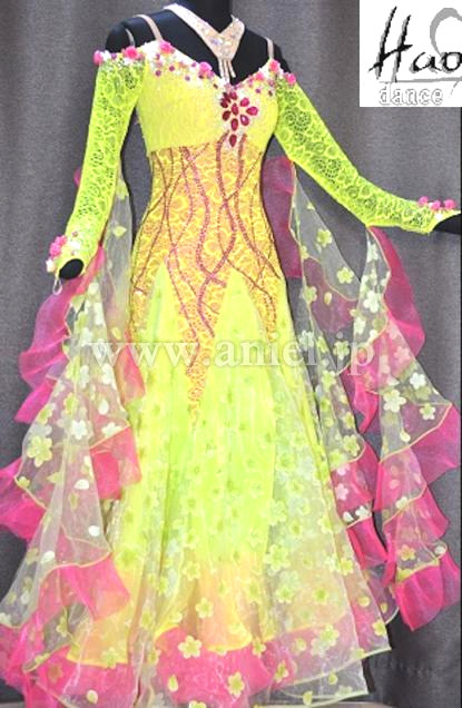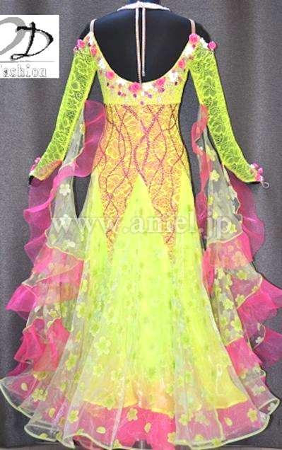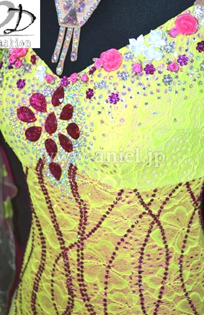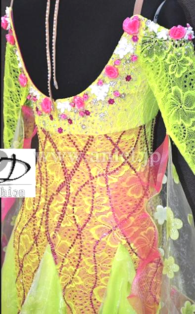 生地→胸元は肌色のベースに蛍光緑色の2wayレース生地を重ね、腰腹部はスパンコール入りピンク色のライクラ生地の上にレースを重ねており、上品なグラデーション感です ;