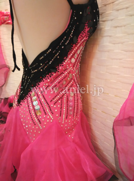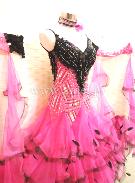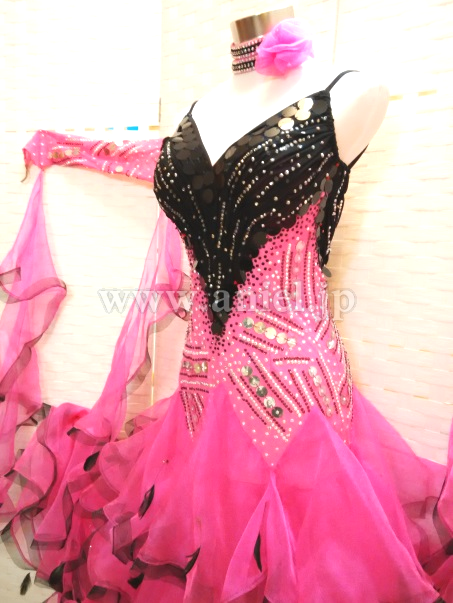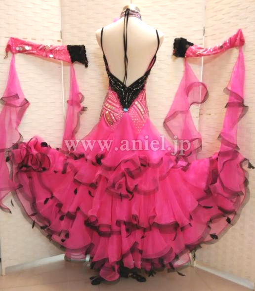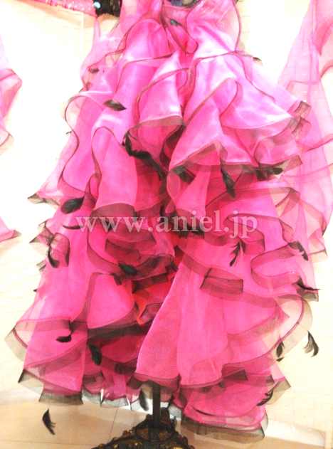 ボディの黒のVラインが身体を引き締めて見せてくれます。ボリュームのあるティアードスカートには黒の羽根が散りばめられています。