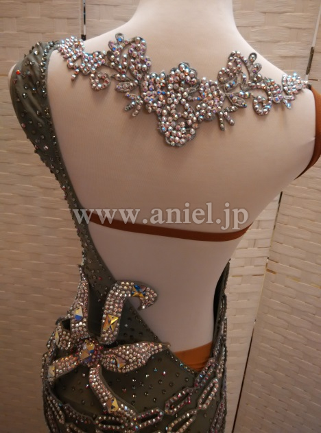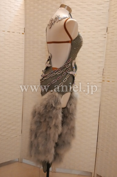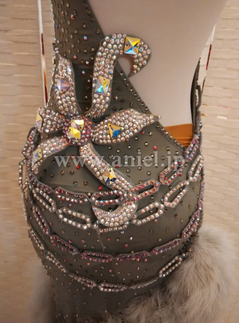 ヒップにはスワロストーンがびっしりと飾られた立体的なモチーフが付けられています。