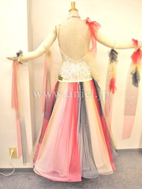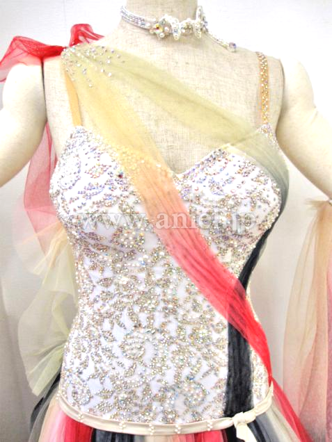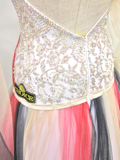上半身は白で質の良い石が豪華です。また胸の部分にはスカートと同じチュールが施されデコルテが開きすぎず安心してお召いただけます。