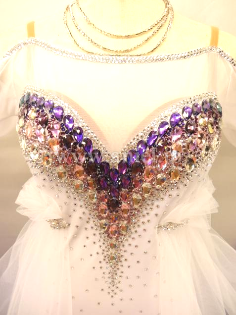 胸元にはクリスタル、ピンク、紫の大粒のストーンで非常に美しい装飾が施されています。
