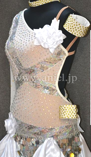 生地→★肌色の生地に白いメッシュ生地を被せ、シルバーのスパン生地で大きなクロスを作り、ボディーをシャープに見せます;