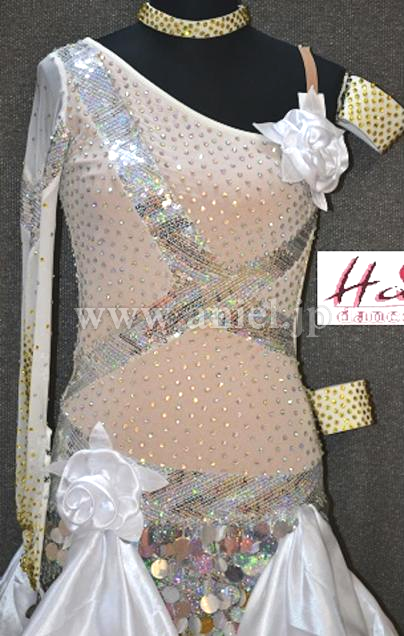 ★右側は白いメッシュ生地一枚仕立ての長袖、左側はラテンらしく肌を露出し、とてもカッコいい非対称なデザインです;