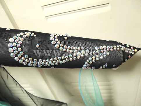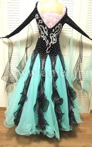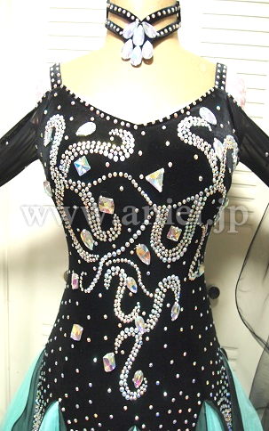 上半身は黒のベルベットに 石がびっしりと張りつめられスカートはミントグリーンが爽やかな感じのドレスです。お袖の先まで石があってすごく華やかなドレスです ドレスはアメリカ製です。