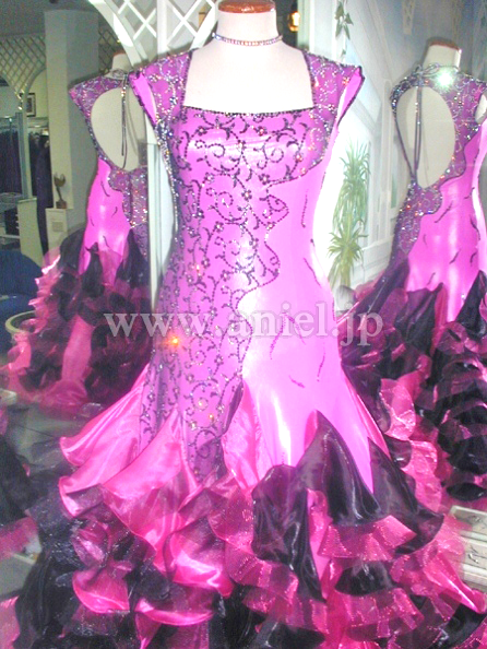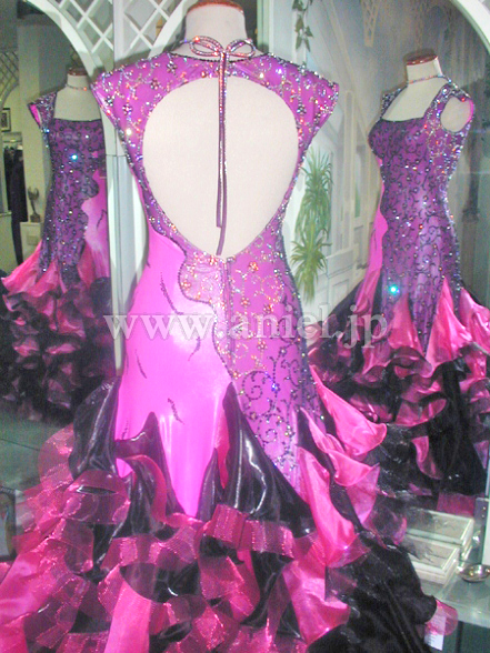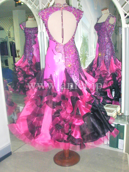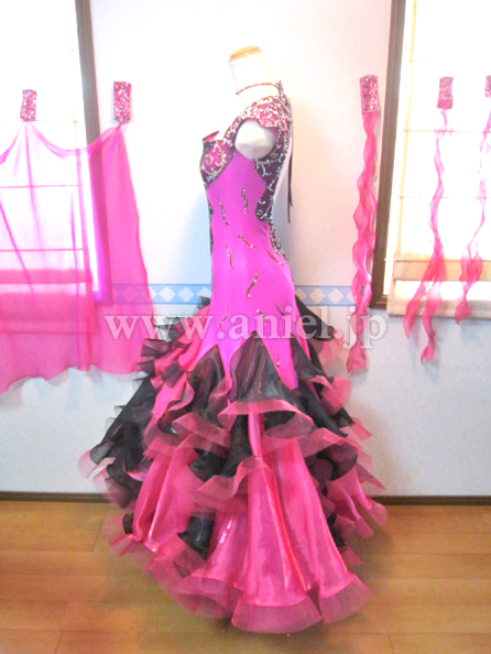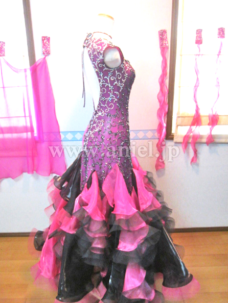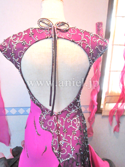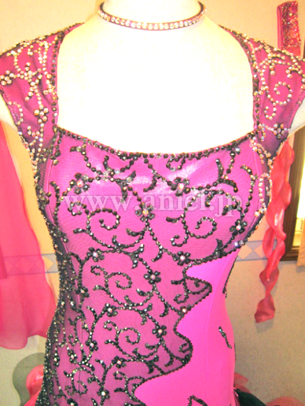 このドレスもイタリアのオートクチュールの高級生地を使用し、画像ではわかりにくのですが左側の濃いピンクの生地は微妙なマーブル模様になっており、右半身はその上に黒のレースを重ねレースの模様の上にオーロラABとジェットヘマタイトの石をふんだんに貼り付けています。