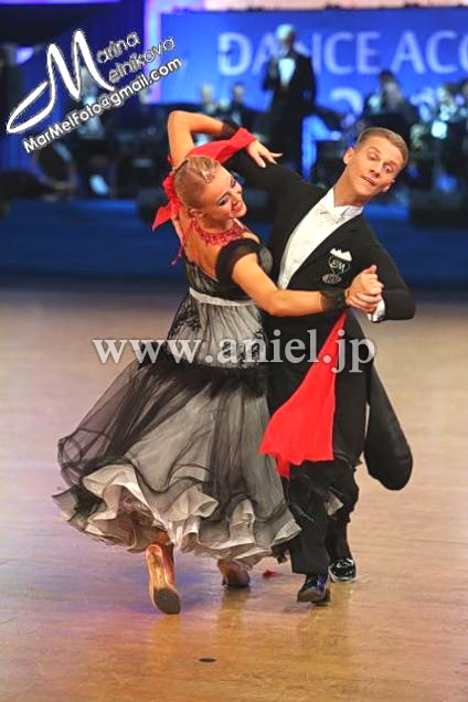 2014年のWDSFジャーマンオープンアマチュアグランドスラムにて3位入賞したEvaldas Sodeika & Ieva Zukauskaite着用スポンサードレス。