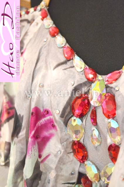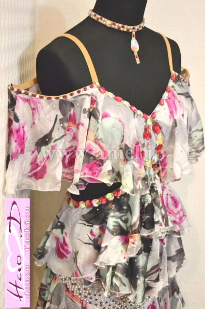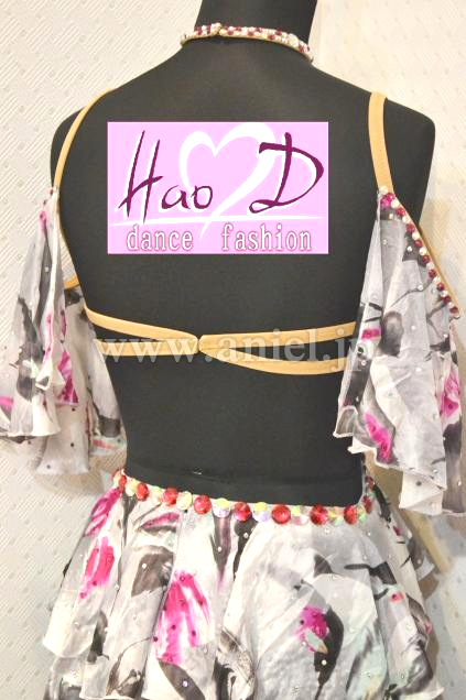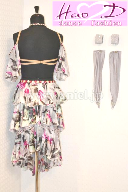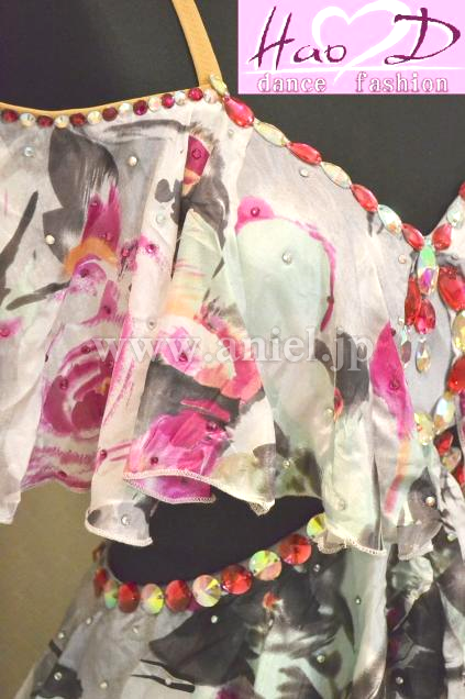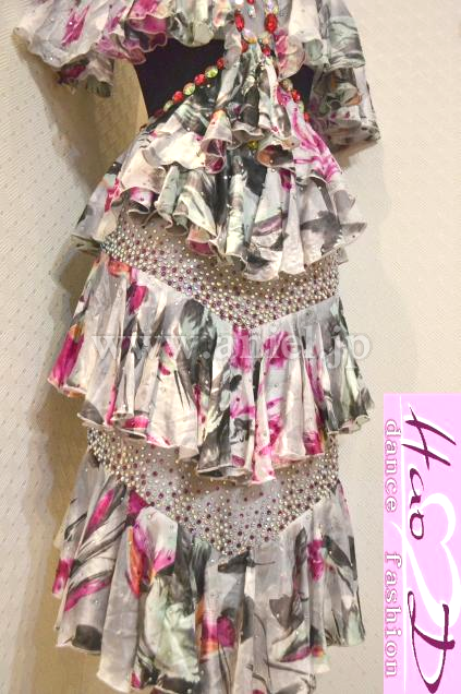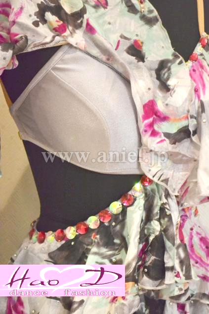 生地→★光沢ありシルバーグレー色のライクラ生地でベースドレスを作り、上に100%シルクの生地でフリルをたっぷり寄せて、踊ると綺麗に跳ねてくれます;