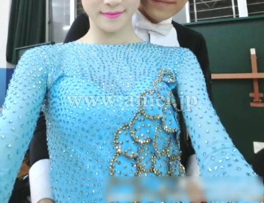 ボディにはスワロフスキーストーンが散りばめられています。ボディや袖の丸い飾りにはゴールドのストーンで縁取りがされています。
