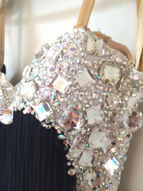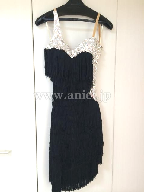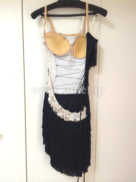 6年前にチョイスで購入。黒のフリンジはたっぷりで、とても良く踊ります。白のトリミングにはラインストーンがふんだんに使われていて豪華です。チョーカー、手袋、バングル、そろいのイヤリング付です。チャチャチャ、ジャイブ、サンバなどに向いていると思います。右腰部分が編み上げのようになっていますのでヒップ・ウエストサイズはある程度幅広く着用可能です。