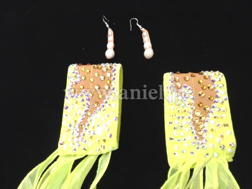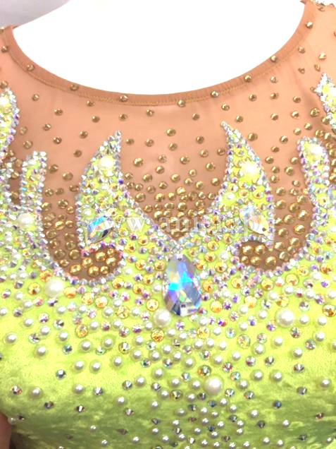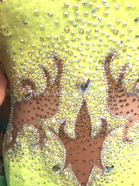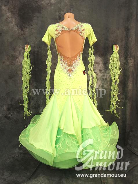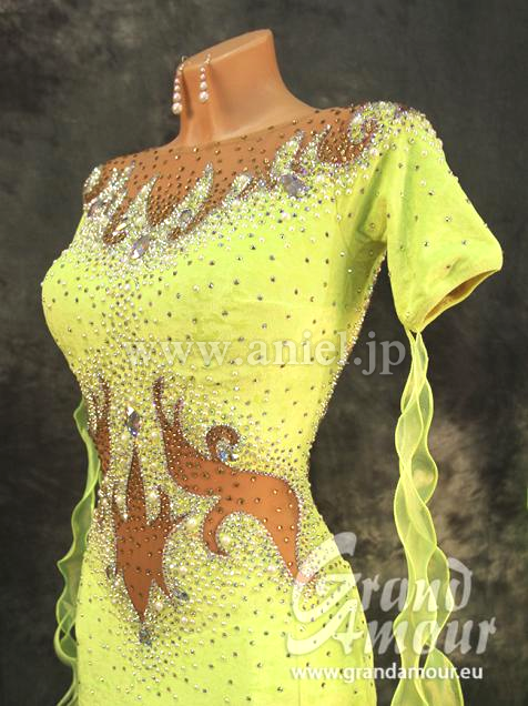 Grand Amourの新作モダンドレスです。ライムイエローのクラッシュベルベットにパールやオーロラの石で装飾が施されています。背中・デコルテ・腕はあまり出ないデザインとなっております。幾何学模様が描かれていて、個性が際立ちます。スカートはボリュームもあり、踊ると広がります。アクセサリーはバングル1セット、ピアスです。