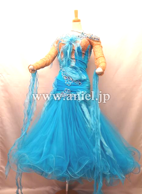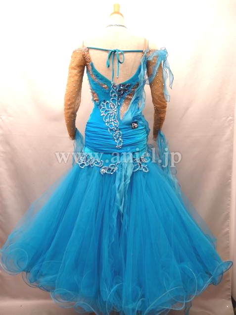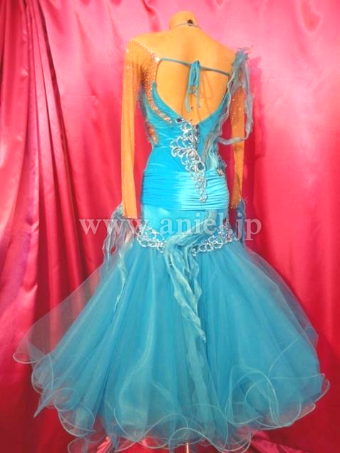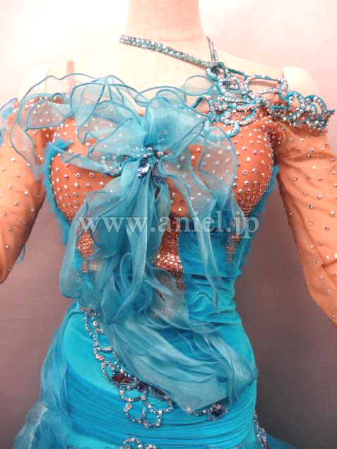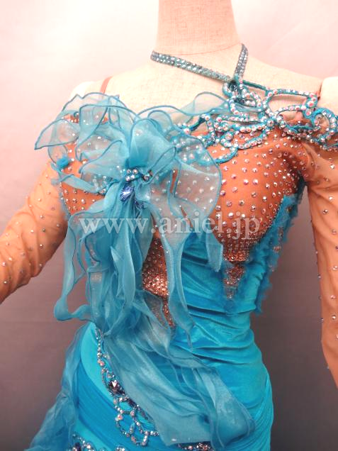 胸元にはフリルが立体的に飾られています。ターコイズブルーのベルベット生地が華やかです。ベージュのボディ部分にはストーンがびっしりと貼られています。