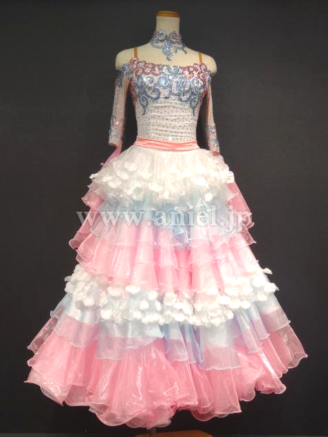 白と水色、ピンクのパステルカラーが重ねられたティアードスカートが可愛らしいドレスです。スカートはボリュームたっぷりです。ホワイトの生地は花びらが散らしてあるデザインになっています。