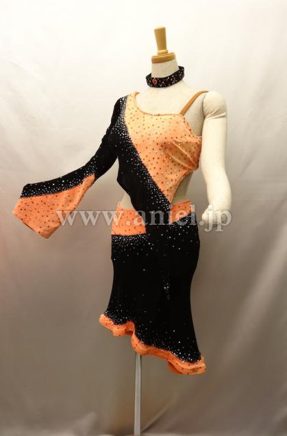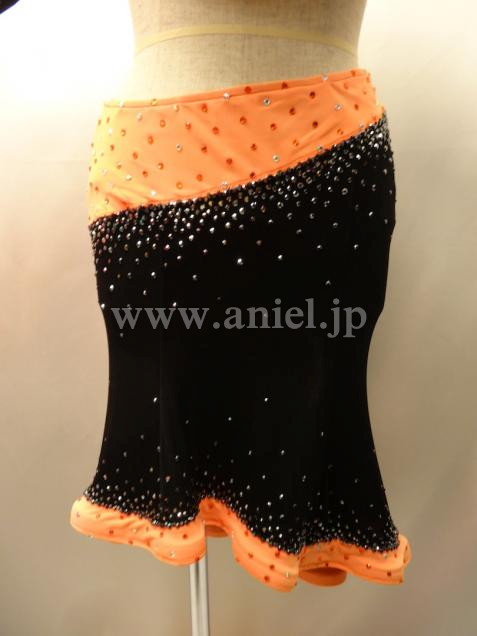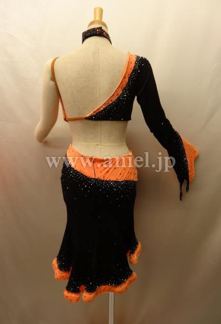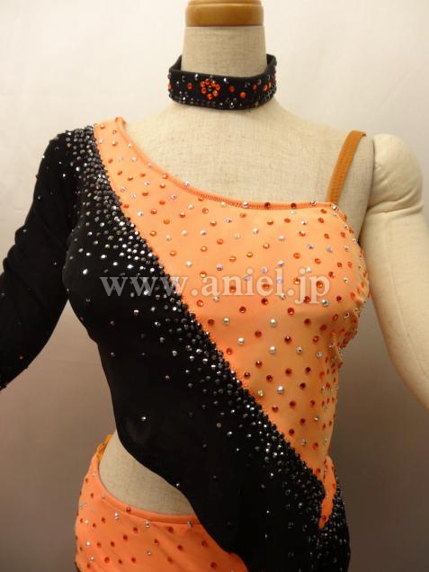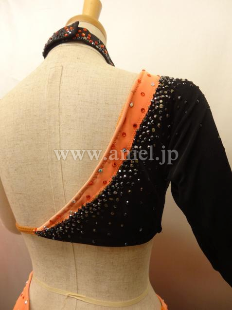 セパレートタイプのラテンドレス。スカートの裾のオレンジテープが踊るとよく舞います。赤と黒のスワロフスキーストーンが上下ともに付けられ、きれいです。