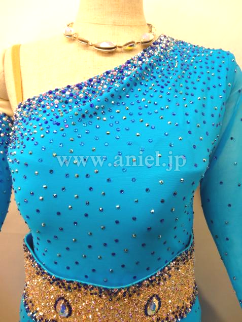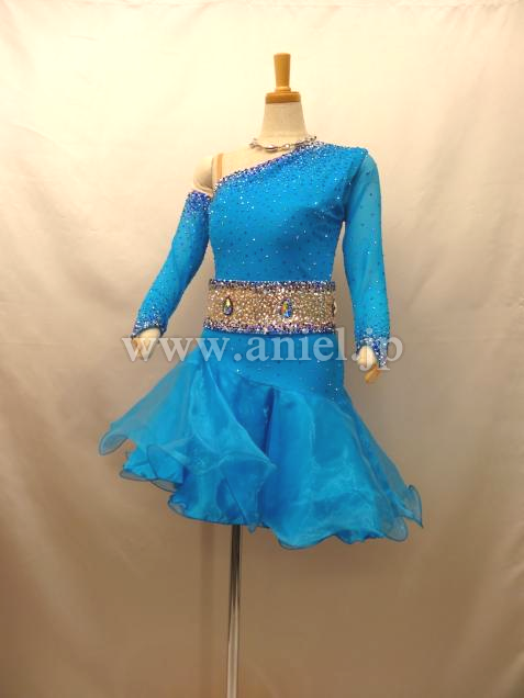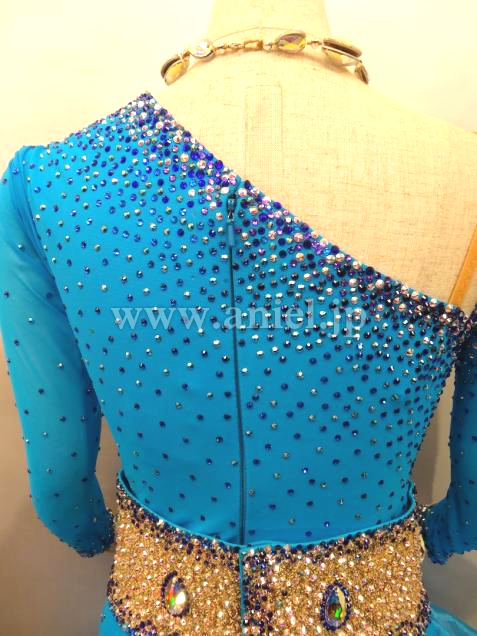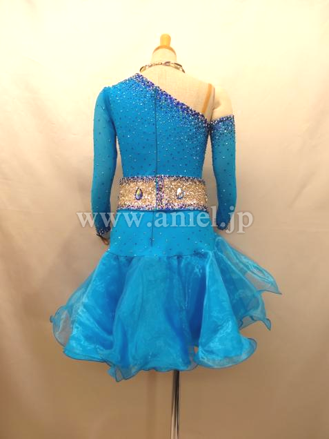 片腕は二の腕までのグローブ、もう片方は袖付きなのであまり露出したくない方に最適。ベルト部分はスパンコール生地に石付きで幅が広く、スカートは程よいボリュームでワイヤー入りなので動きもよく脚長効果ありです。年齢問わずエレガント&かわいいドレスです。